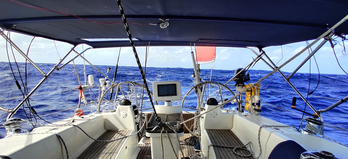 Kas mäletate veel nõuka-aegset Tallinna lõbustusparki? Seal oli üks selline pöörlev tuba. Käis ühele poole 30-40 kraadi ja siis teisele poole sama ja kuna ka seinad pöörlesid, tekkis tunne, et oled vahepeal praktiliselt pea alaspidi selles illusioonide toas. Kui seinte pöörlemine ära jätta, siis meil käib siin umbes samasugune šõu juba kolmandat päeva järjest. Ca 4 meetrised lühikese perioodiga lained tulevad tagant baakstagist ja lükkavad paadi kõigepealt ühele poole 30kraadi kreeni ja siis kohe teisele poole sama palju. Kuna laine tuleb diagonaalist, siis ei ole see isegi mitte lihtsalt edasi tagasi kõikumine, vaid paat joonistab kogu aeg midagi number 8 taolist.