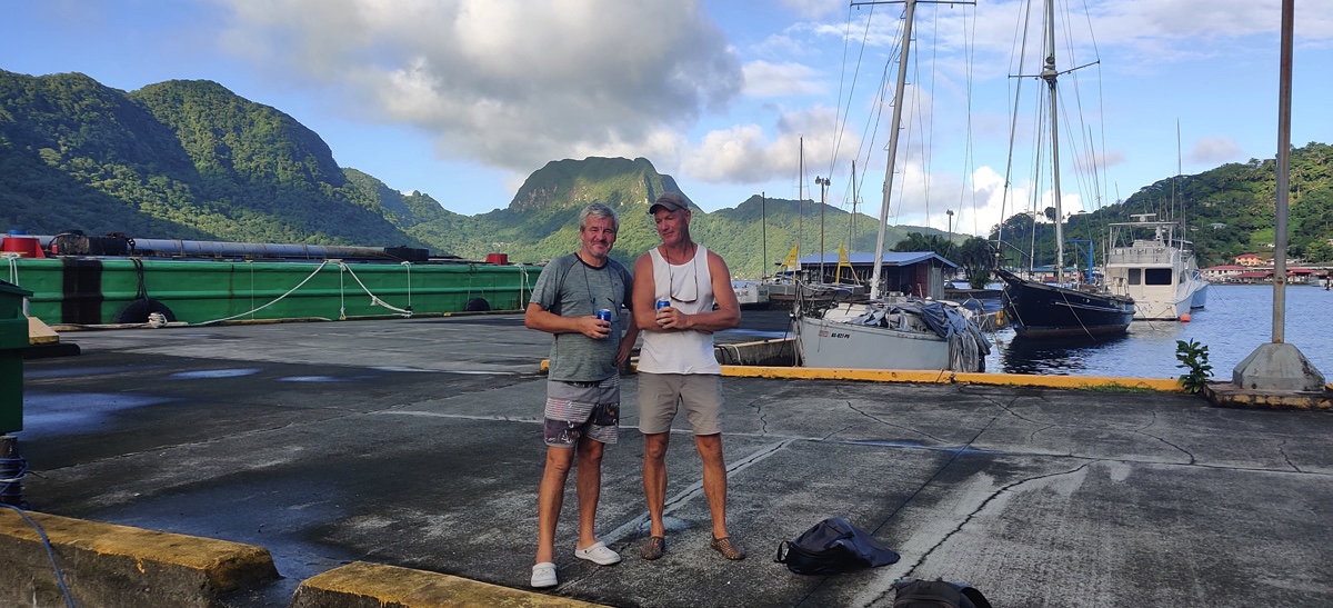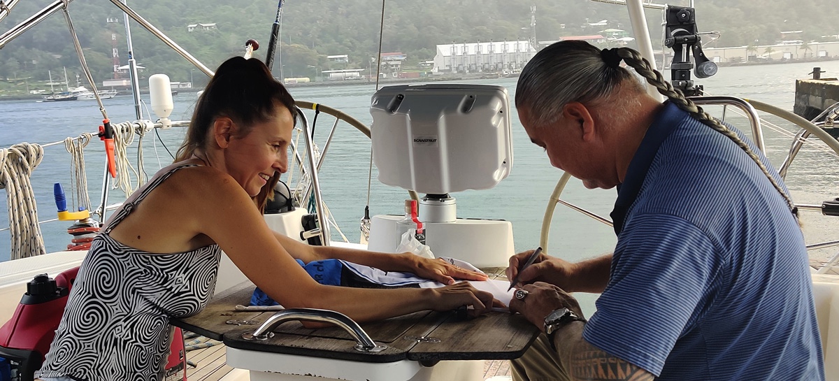 Kohe ründas meid kaldale kogunenud ametnike armee. Kõik olid saabunud Jeepidega, üks uhkem kui teine. Kõigepealt muidugi COVID test, siis korjas immigratsiooniametnik meie passid ära, ja edasi hakkasime Veikoga "käsitsi trükkima" tervet virna dokumente. Paistis, et kõige tähtsam paber sellel saarel on Crew List - seda nõudis iga ametnik. Digitaalsest versioonist emailile kõik keeldusid. Mis parata, võtsime aga järgmise valge A4 ja muudkui vihtusime Crew Liste.