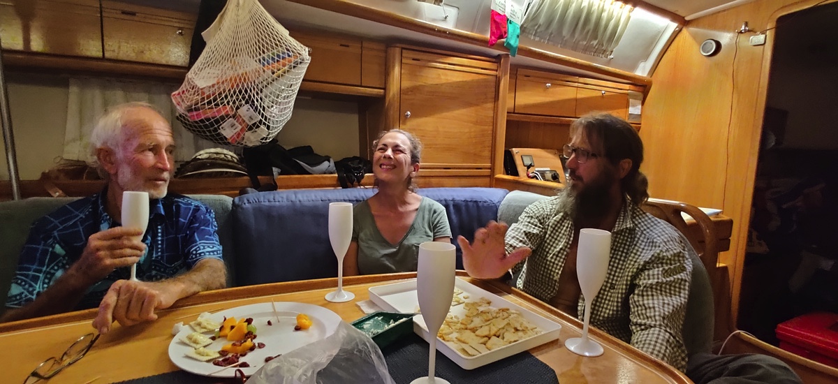 Poole tunni pärast oli sõukruvi taas paadi all ja kaldale kogunenud šõud jälgivate ümberkaudsete jahtide kaptenid olid oodatud Picasso pardale tervitusklaase kokku lööma. Muuhulgas saime tuttavaks ka Leedust pärit soolopurjetaja Audriusega, kes seilab merd juba üle 10 aasta ja kellega Heldur Suun oli omal ajal kohtunud Ushuaias.