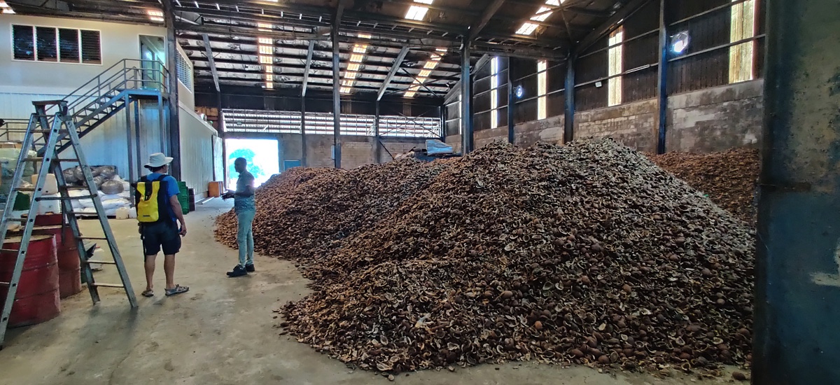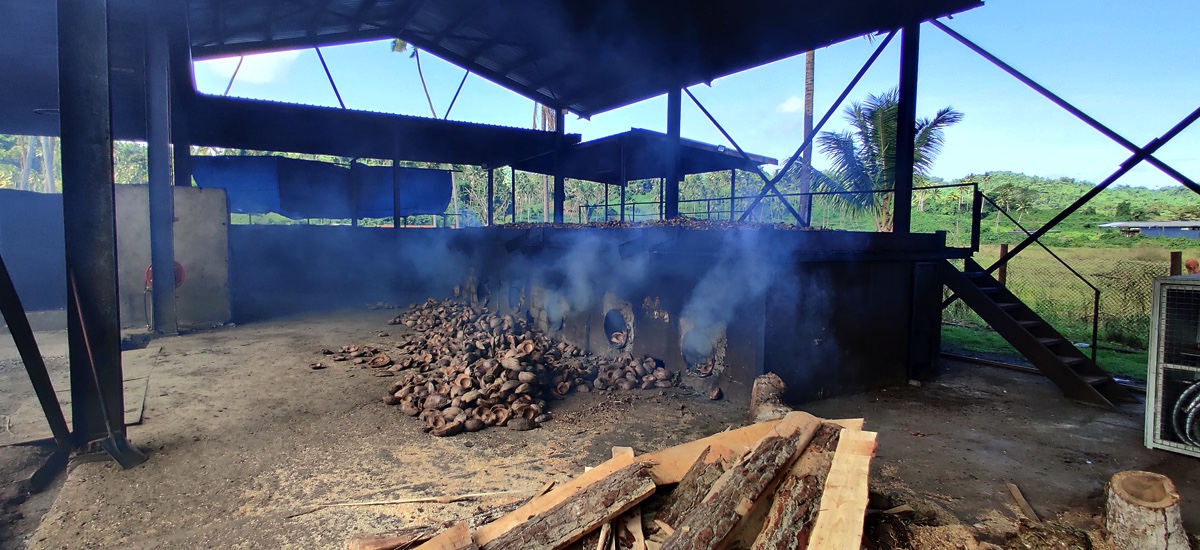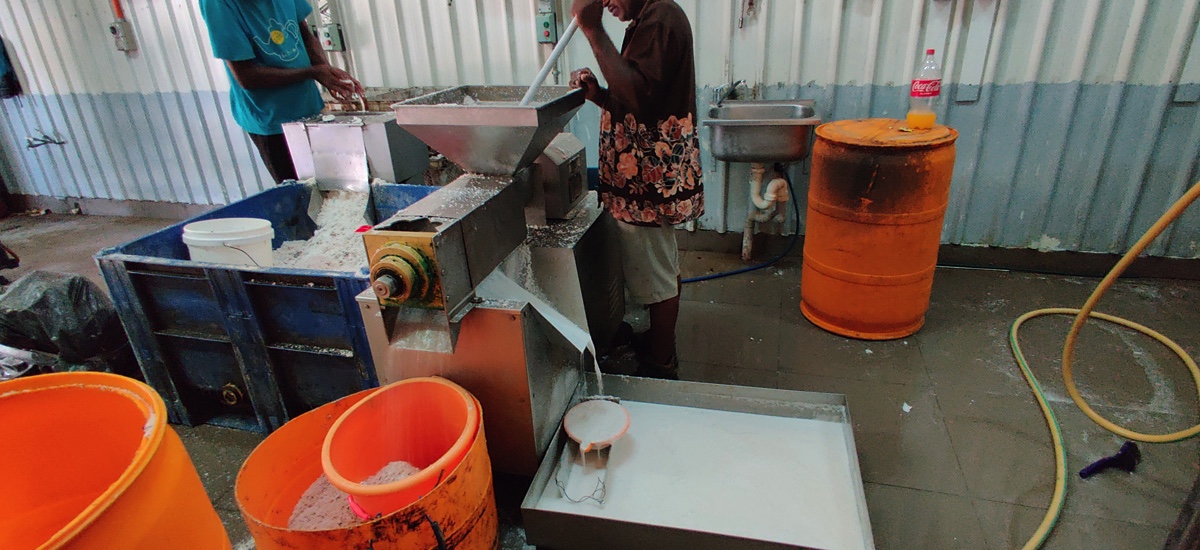 Iga kuu võtab vabrik vastu 150 tonni kookospähkleid. Need sorteeritakse kaheks - mittesöödava ja söödava õli tootmiseks. Pähklid puhastatakse ja sisust tehakse sütel kuumutamise/aurus kuivatamise abil copra.