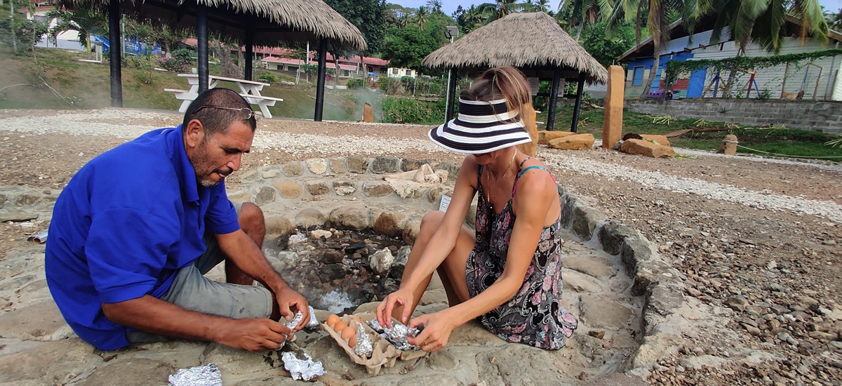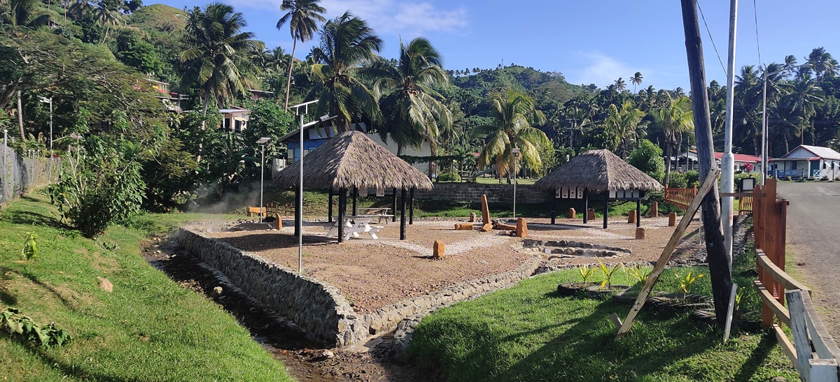 Copra vabrikust mitte kaugel on saare suurim kosk aga sinna me ei jõudnudki. Meil oli hoopis tegemist sadama läheduses asuvate kuumaveeallikate ülesotsimisega, sest poest ostetud munad vajasid keetmist ja ärasöömist:) Allikate ümber on seatud lauakesed pikniku jaoks. Ilmselgelt on see kohalike hulgas populaarne paik. Saabuski üks kohalik, viskas oma kilekoti konservidega vabasse allikasse, pani lauatüki peale ja kadus.