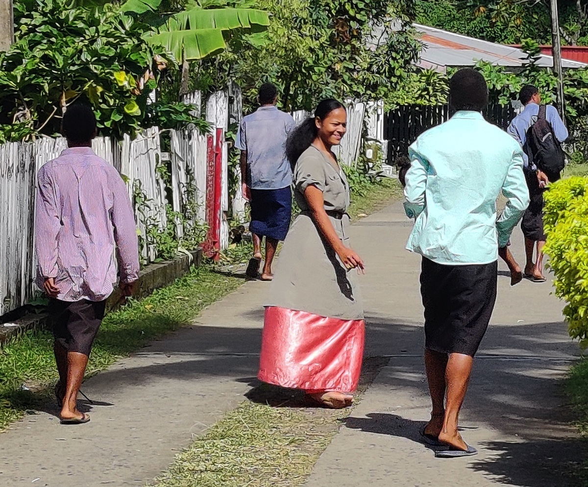 Kiriku juures toimetasid noored mehed, seljas triiksärgid, kaelas lipsud ja puusade ümber mustad sulud. Sulu on sirge nööriga ümber keskkoha kinnitatav pikk seelik, mida siinsed härrad kannavad viigipükste asemel.