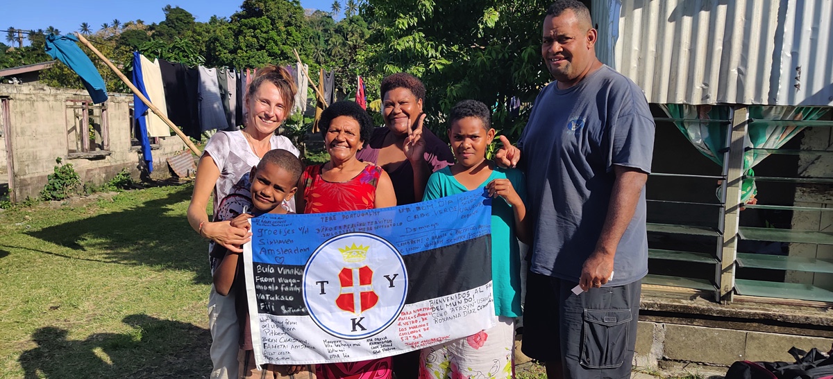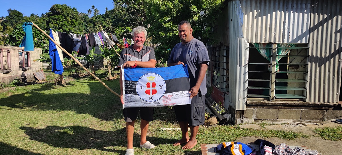 Rääkisime kohalolijatele oma reisi missiioonist - viia Tallinna Jahtklubi lipp ümber ilma ning koguda sellele igast riigist kohalikus keeles tervitusi. Rosi oli hea meelega nõus meile kirjutama tervituse Fidzi poolt.