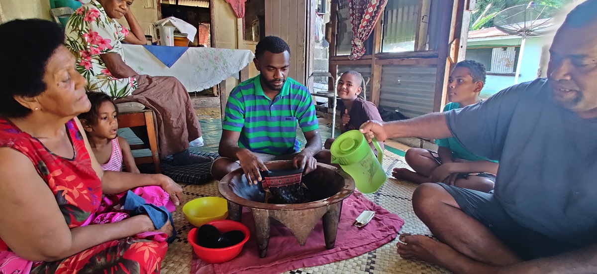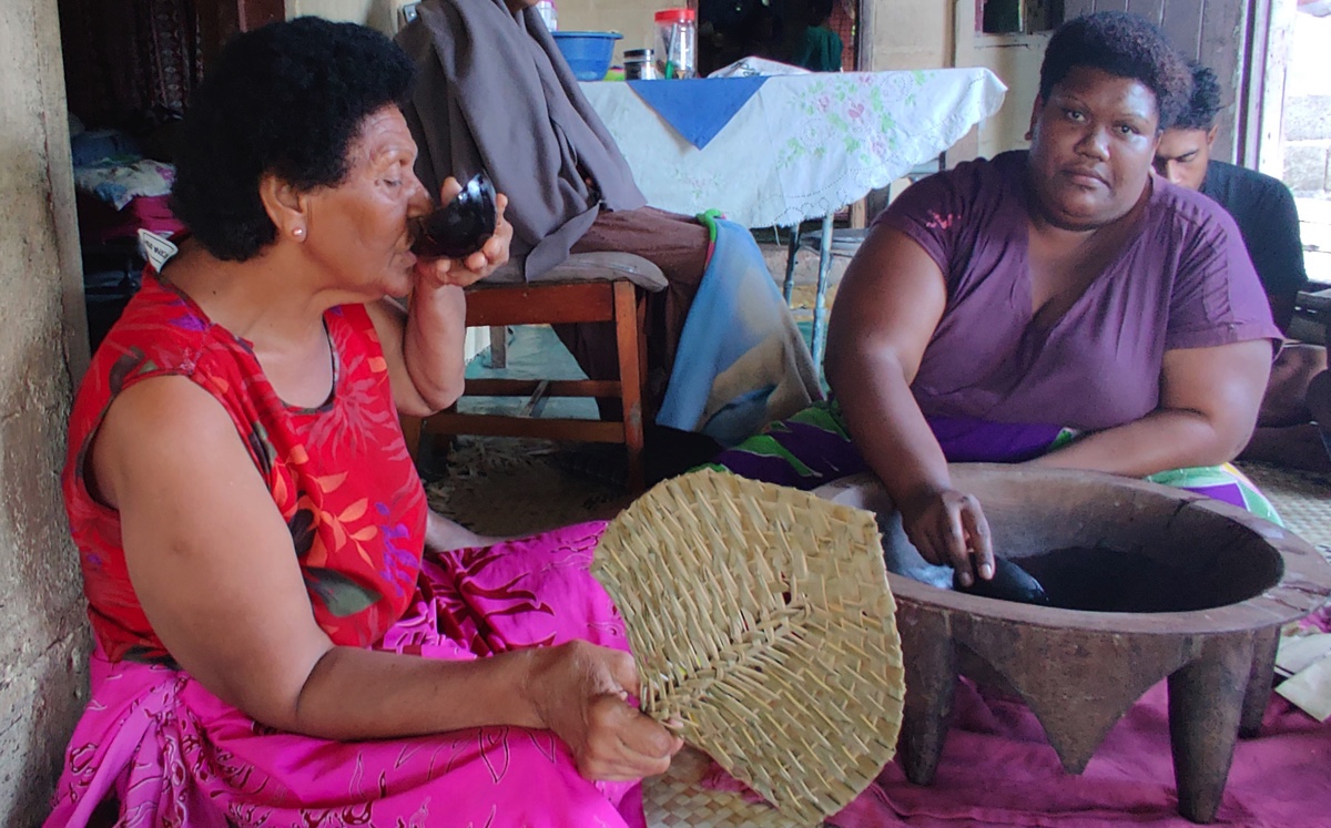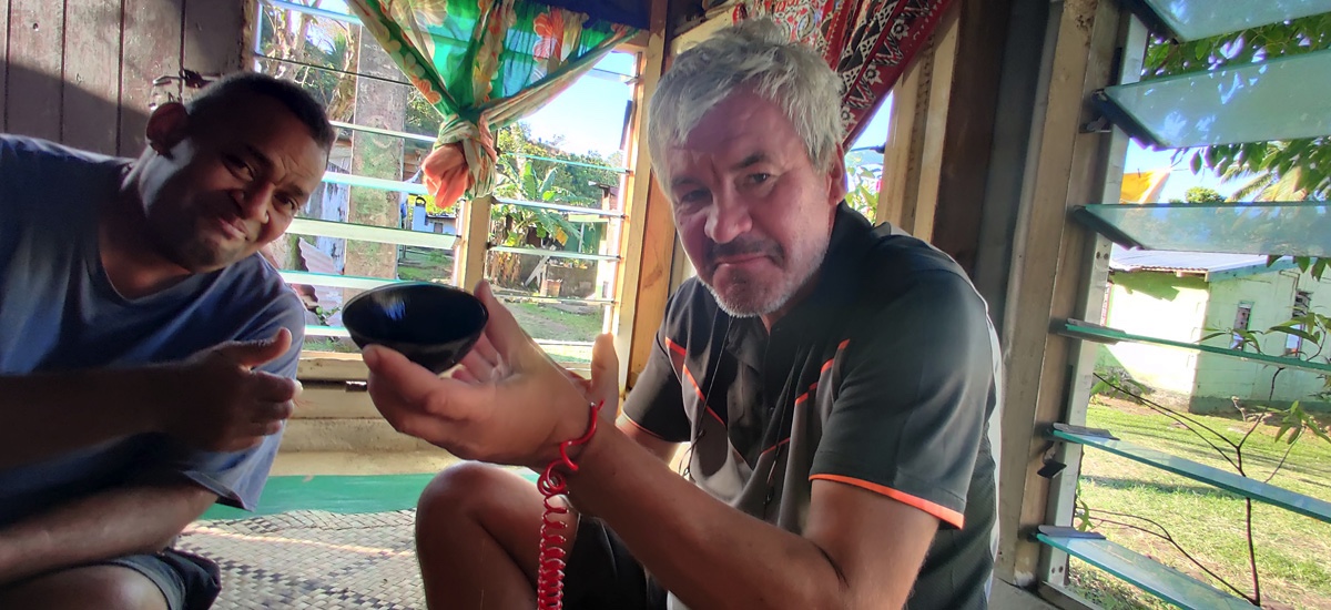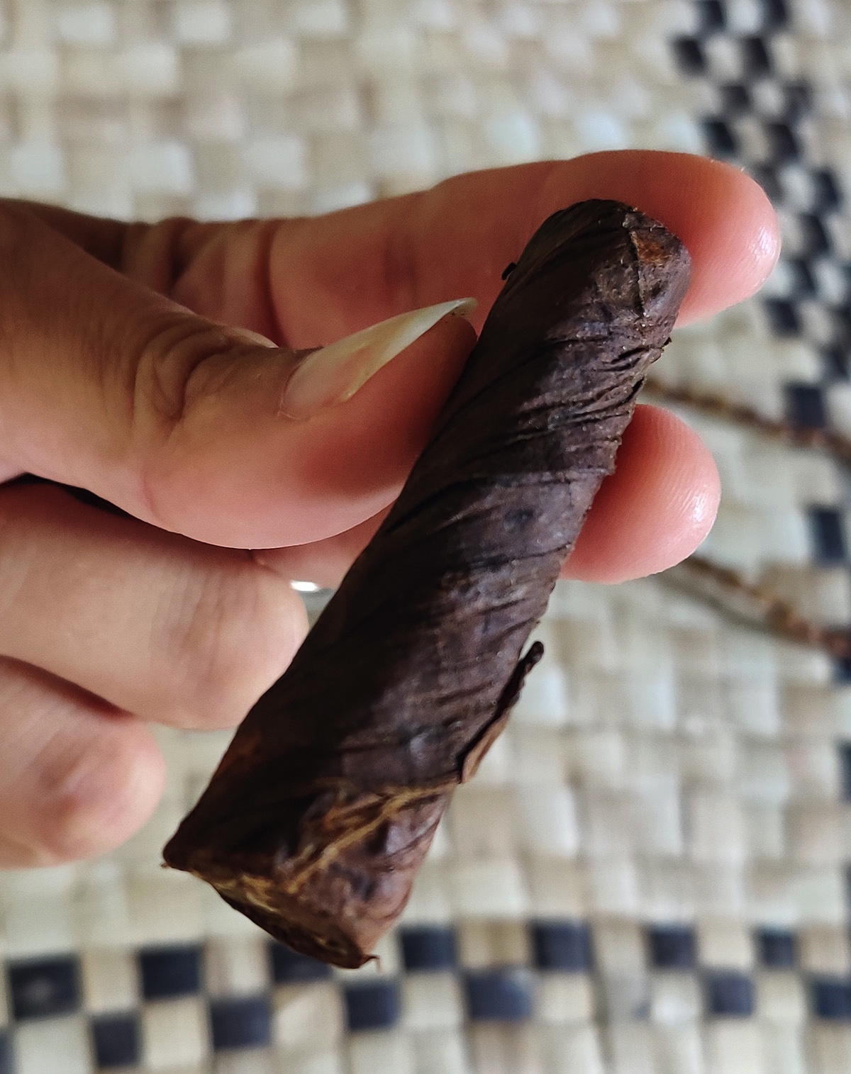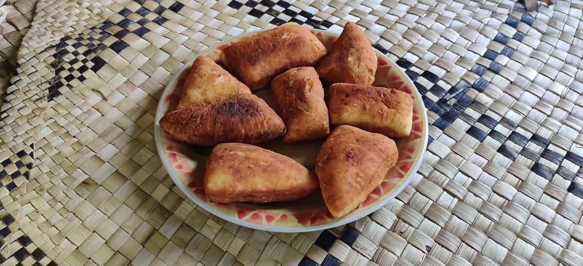 Kava joomise ajal astus sisse küla vanem, kes suitsetas kohalikest taimedest tehtud suitsu. Meile tutvustati ka kohalikku sigarit aga me pole paraku suitsu mehed:) Kava kõrvale pakuti värskeid pirukasarnaseid pannkooke. Väga maitsvad!