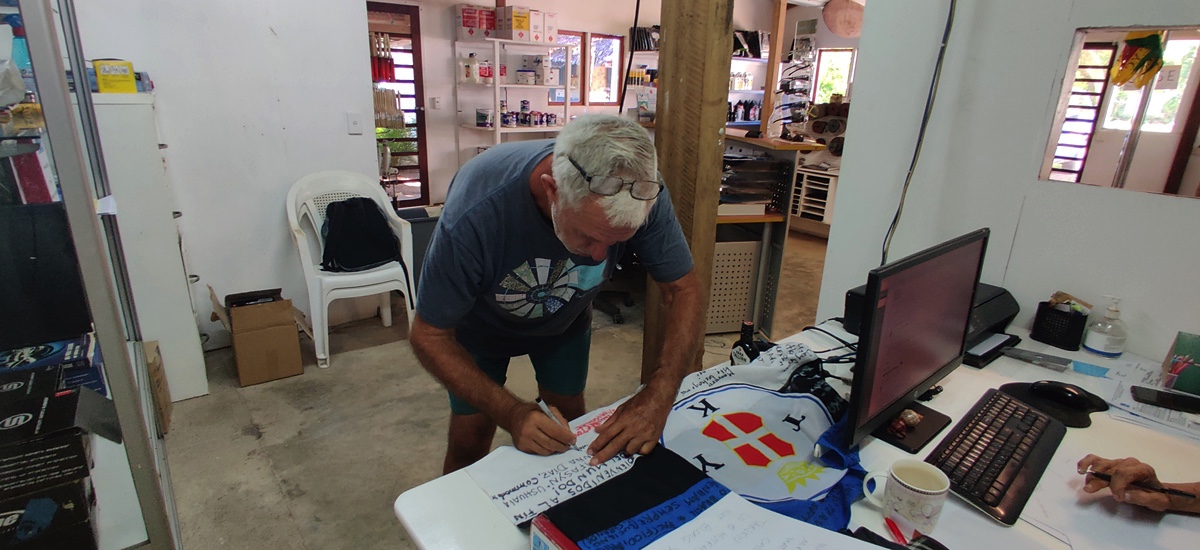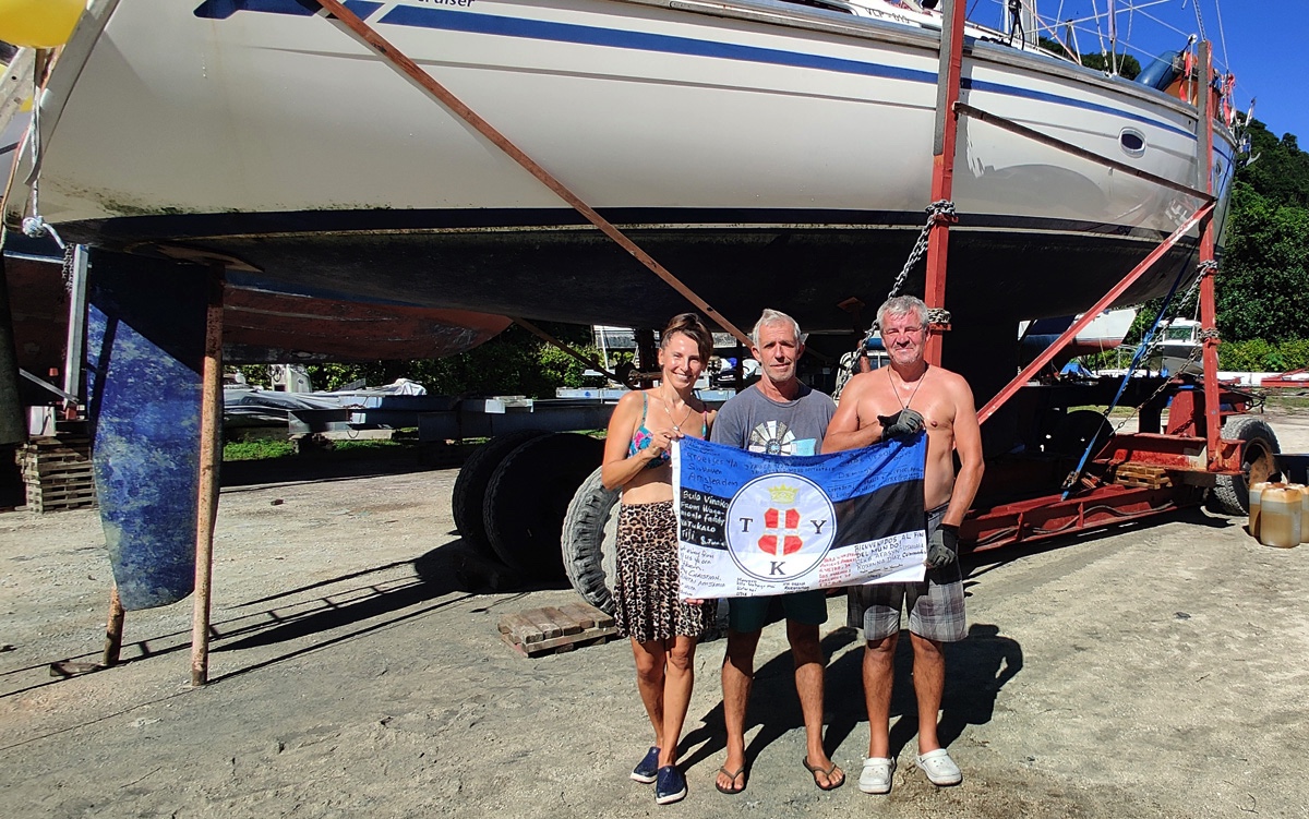 Rääkisime Geoffile oma reisi missioonist ja Tallinna Jahtklubist ning pisut kohmetuna aga hea meelega kirjutas ta lipule tervituse. Tänutäheks Vana-Tallinn ja pisut eesti kommi:)