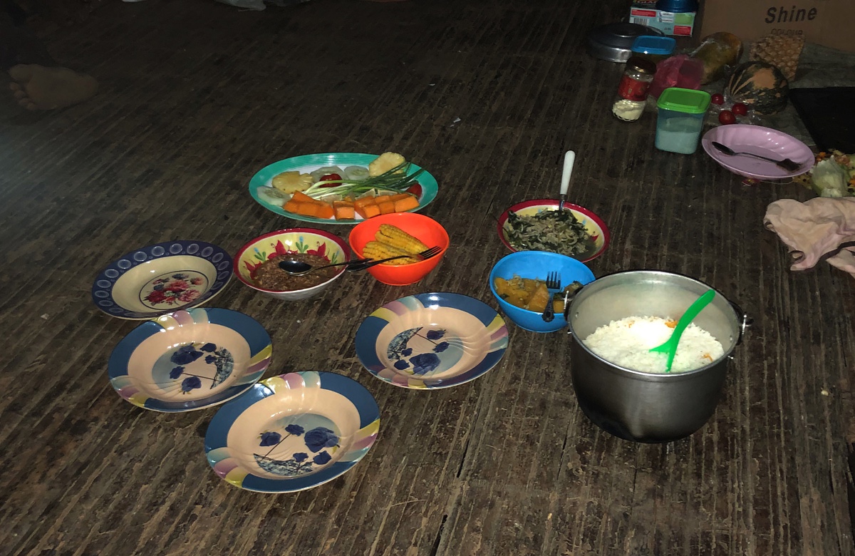 Sööme tavapärast kohalikku toitu - riisi ja erinevatest lehttaimedest ning kalakonservist tehtud kastmelaadset ollust, mis maitseb üllatavalt hästi! Tunnustame Jose kokakunsti. Magustoiduks papaia.