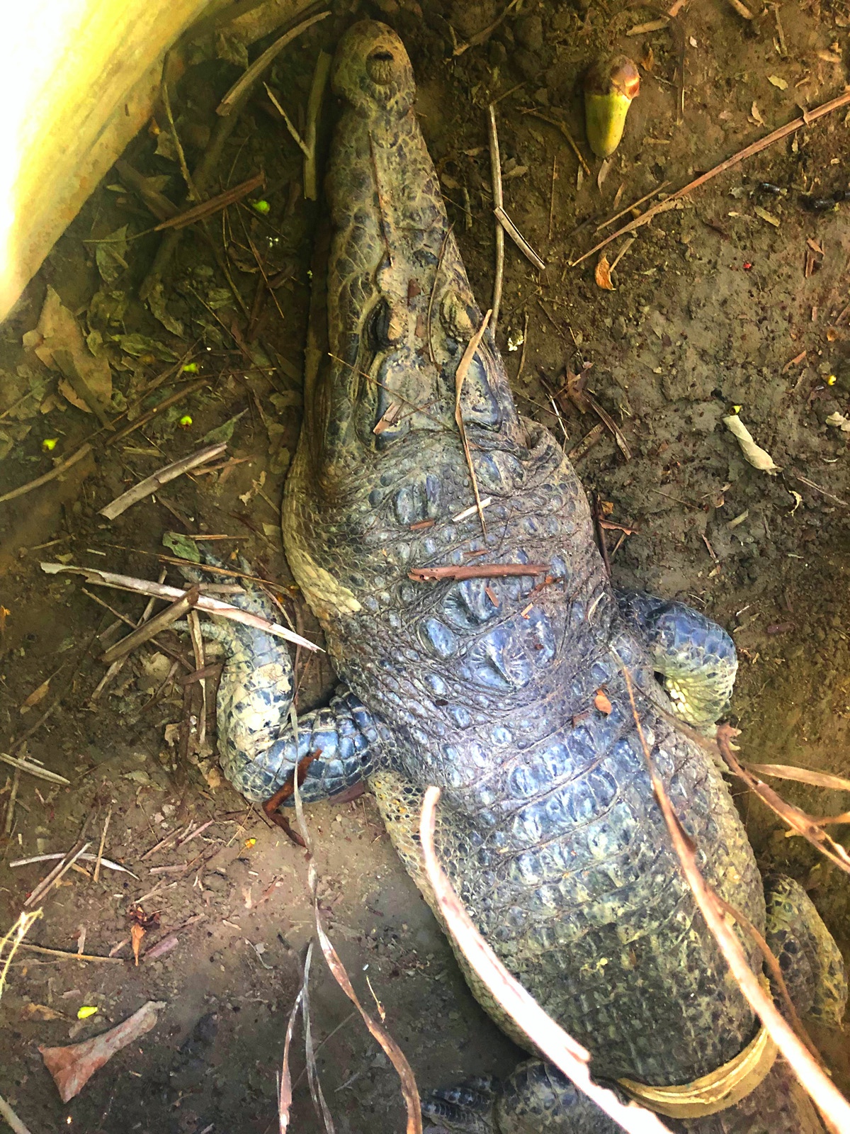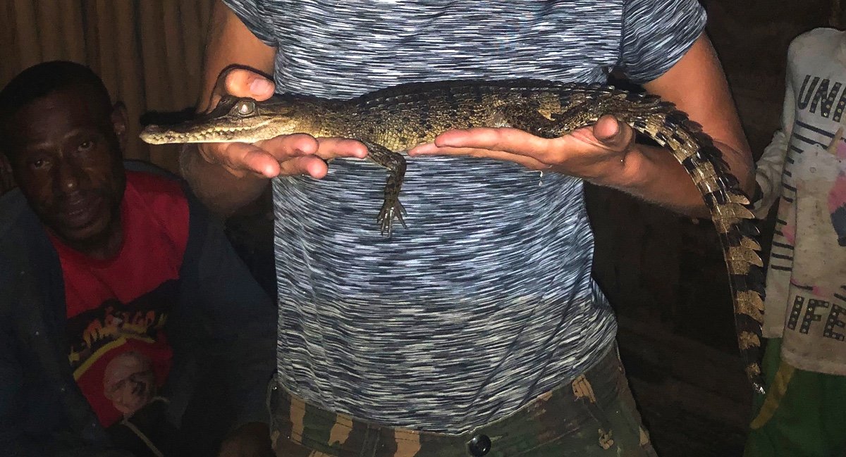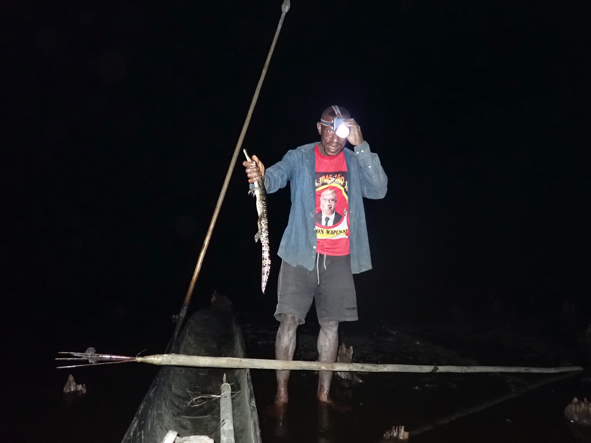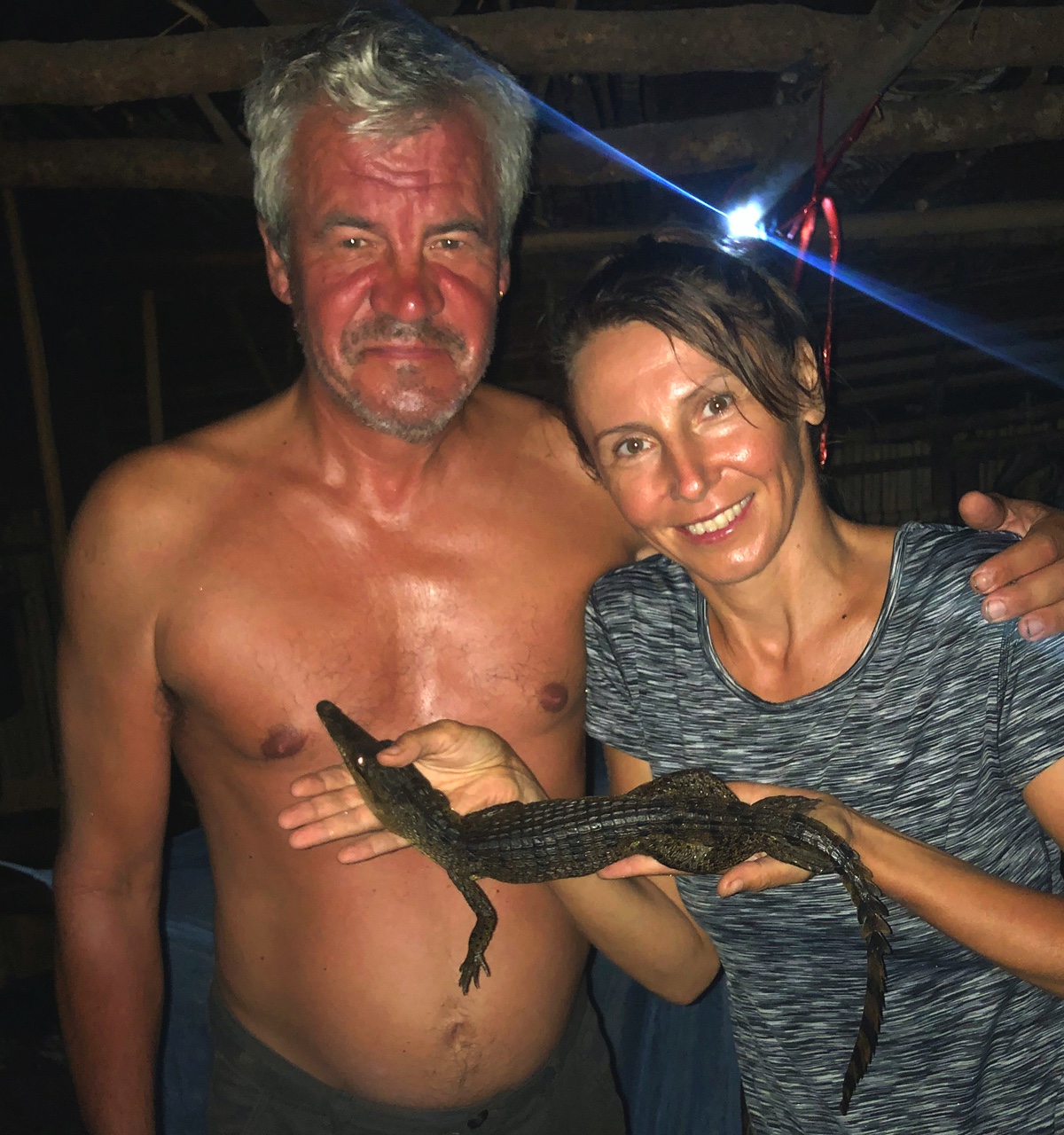 Hommikul kell 3 sättisime end krokodilli- jahile. Pimedas lambivalgusel krokodillide silmad hiilgavad. Nii leitakse krokud üles. Kanuud, milles kohalikud jahti pidades püstijalu sõidavad, tunduvad valgele inimesele istudeski nii ebakindlad, et suurem osa energiast kulub kõikuva kanuu külge klammerdumisele.