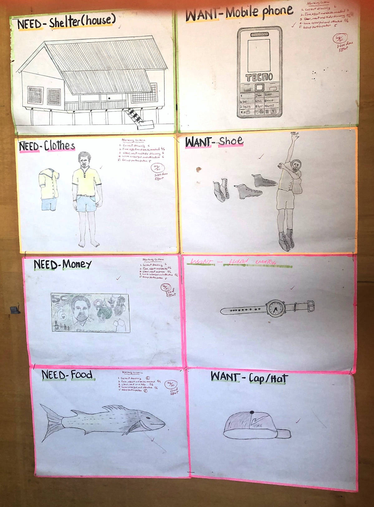 Siinsetest väärtushinnangutest annab laheda ülevaate laste kodutöö: VAJADUSTE rubriiki kuuluvad maja, riided, raha ja toit aga nn TOREDUSTE (mida loomulikult tahetakse) hulka kuuluvad mobiiltelefon (levi on olematu), kingad (kõik käivad siin paljajalu, kell (!) ja nokamüts.