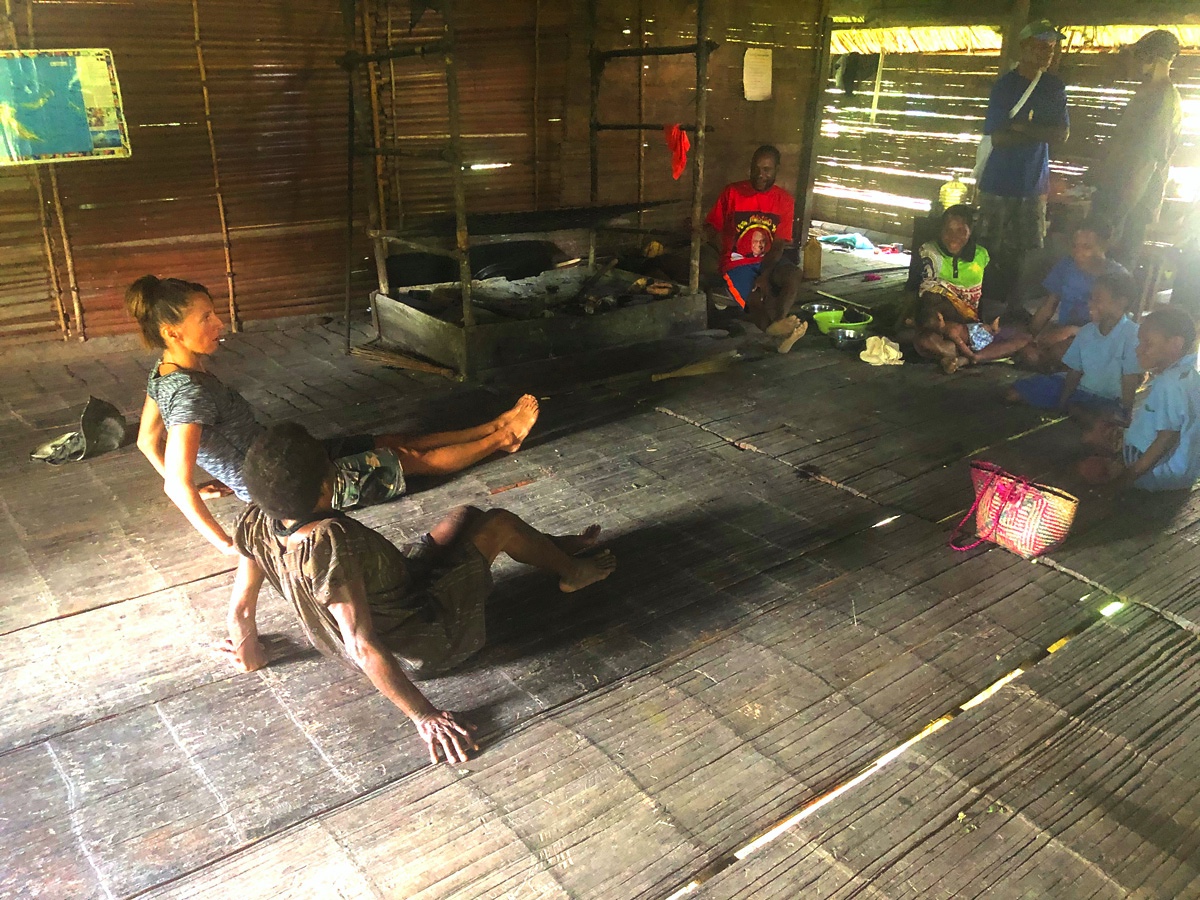 Vanamammi oli päri ja nii viskasime end hüti põrandale ja hakkasime aga otsast pihta. Hulk külaelanikke oli seda etendust pealt vaatama kogunenud. Kuna vanamammi mälu polnud suurem asi, palus naine neilgi harjutused meelde jätta, et mammikest hiljem aidata. Igatahes väga lustlik üritus oli:)