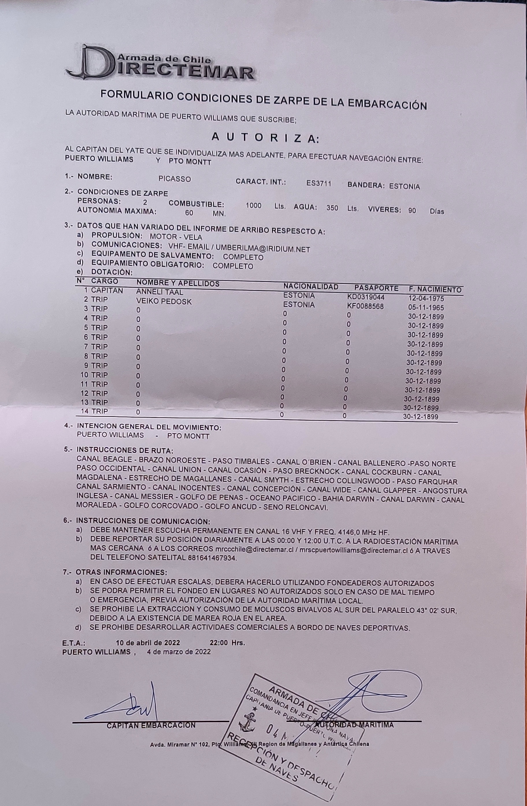 Nii läkski, kell 15 oli templiametnik tolliametis viksilt kohal ja templid paberil marssisime taas sadamakapteni juurde, kus meid juba oodati. Vormistati riiki sisenemine ja anti zarpe Puerto Montti. Viimase vormistamisel küsiti, mis on planeeritav ETA, kui palju meil on vett, kütust ja toitu ning pidi panema hulga linnukesi ühele paberile, kus olid küsimused meie ohutusvarustuse kohta. Maksta tuli 20 dollarit majakamaksu. Sellega pääsesimegi.
