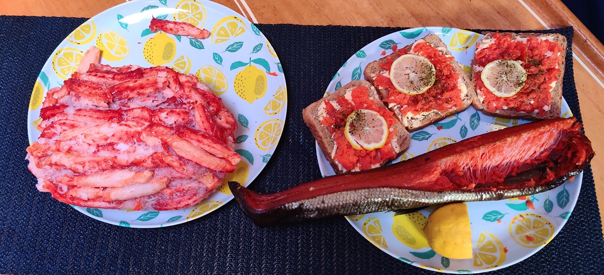 Roxanna oli meile toonud kilo puhastatud ja keedetud kingkrabi ning kohalikku suitsulõhet.