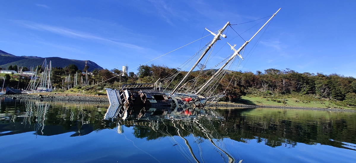 Leidsime sealt ühe vaba poi ja haakisime end külge. Otse meie kõrval on maa külge kinni tõmmatud ilmselgelt vanadussurma lõpnud kahemastiline purjekas, mis lisab paigale hüljatuse muljet.