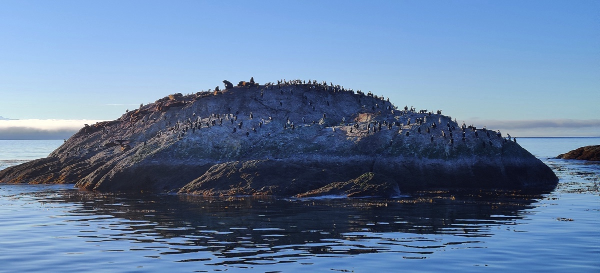 Melinkast välja sõites ootas ees taas paras saarte labürint, õnneks läksid admiralid ees ja me ei pidanud ise nuputama, kust läbi saab. Nautisime vahvaid kaljusaari, millest mõned olid okupeeritud kormoranide ja merilõvidega, kellest viimased meie lähenemisel kerge paanika saatel lõbusa vettehüppe maratoni korraldasid. Kormoranid vahtisid seda tralli aga sügavas rahus pead liigutamata pealt.