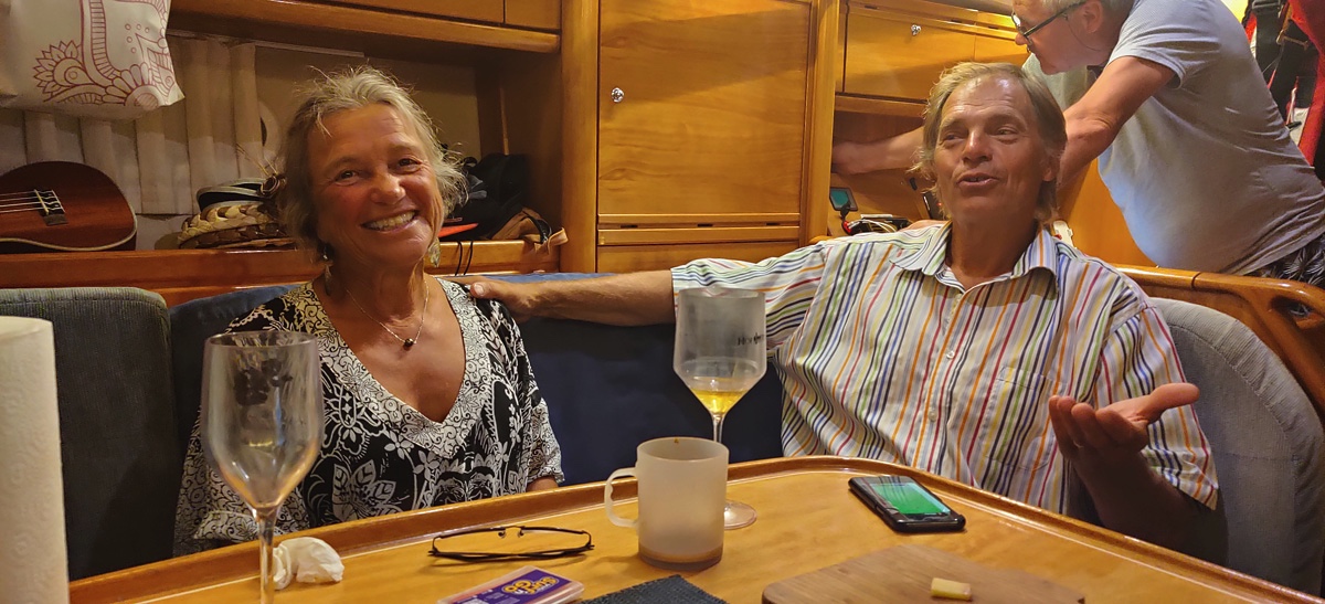 Tegime Ulfi ja Piaga kaldarestos taaskohtumise puhul ühise meeleoluka õhtusöögi. Neil oli raske uskuda, et olime tulnud Eestist läbi Patagoonia Prantsuse Polüneesiasse 10 kuuga. Nemad olid seda sama trippi teinud 10 aastat! Nende strateegia on selline, et korraga purjetavad nad max 10 kuud. Siis pargivad oma jahi kusagile ja sõidavad mõneks ajaks koju (COVIDi perioodil oli paus isegi 2 aastat). Kui tuleb taas tahtmine ja idee, siis korjavad oma jahi ilma pealt üles ning putitavad pisut ja sõidavad edasi. Jaht on neil väga väike (25 jalga), mootor 18 hobujõudu ja elektroonikat sees minimaalselt aga korralik HydroWane on peal. Duubeldatud küttesüsteem samuti. Näiteks talvitus nende jaht Ushuaias poi küljes ja veetis COVIDi aega Puerto Monttis.