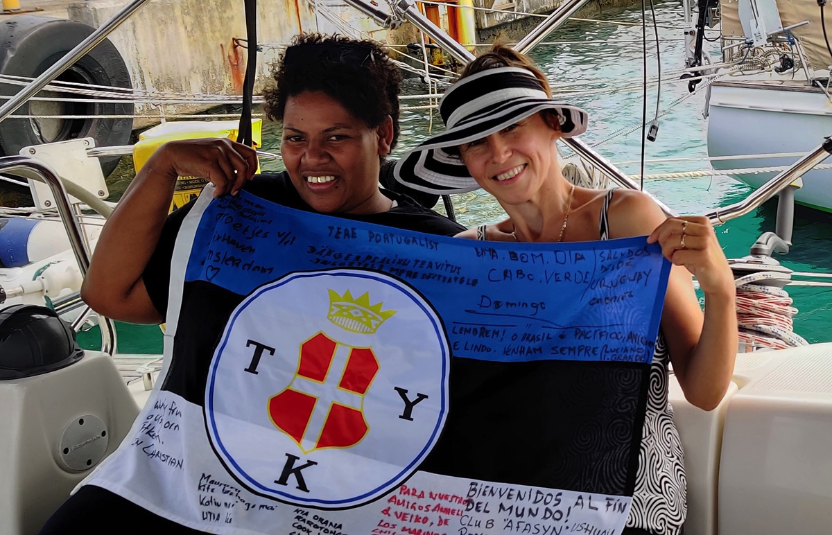 Rääkisime Terryle oma reisist ja Eestist ja jahtklubist ning kinkisime tänutäheks Vana-Tallinna. Tema omakorda kirjutas meie lipule tervituse Cooki saarte poolt. Lubasime kontakti pidada ja Fijil ta ema üles otsida. Ta unistab purjetamisest ja oleks hea meelega meiega kaasa tulnud:) Väga vapper oli temast igatahes juba jullaga meie paati tulla arvestades korralikku lainetust kai ääres.