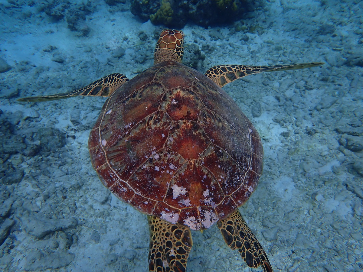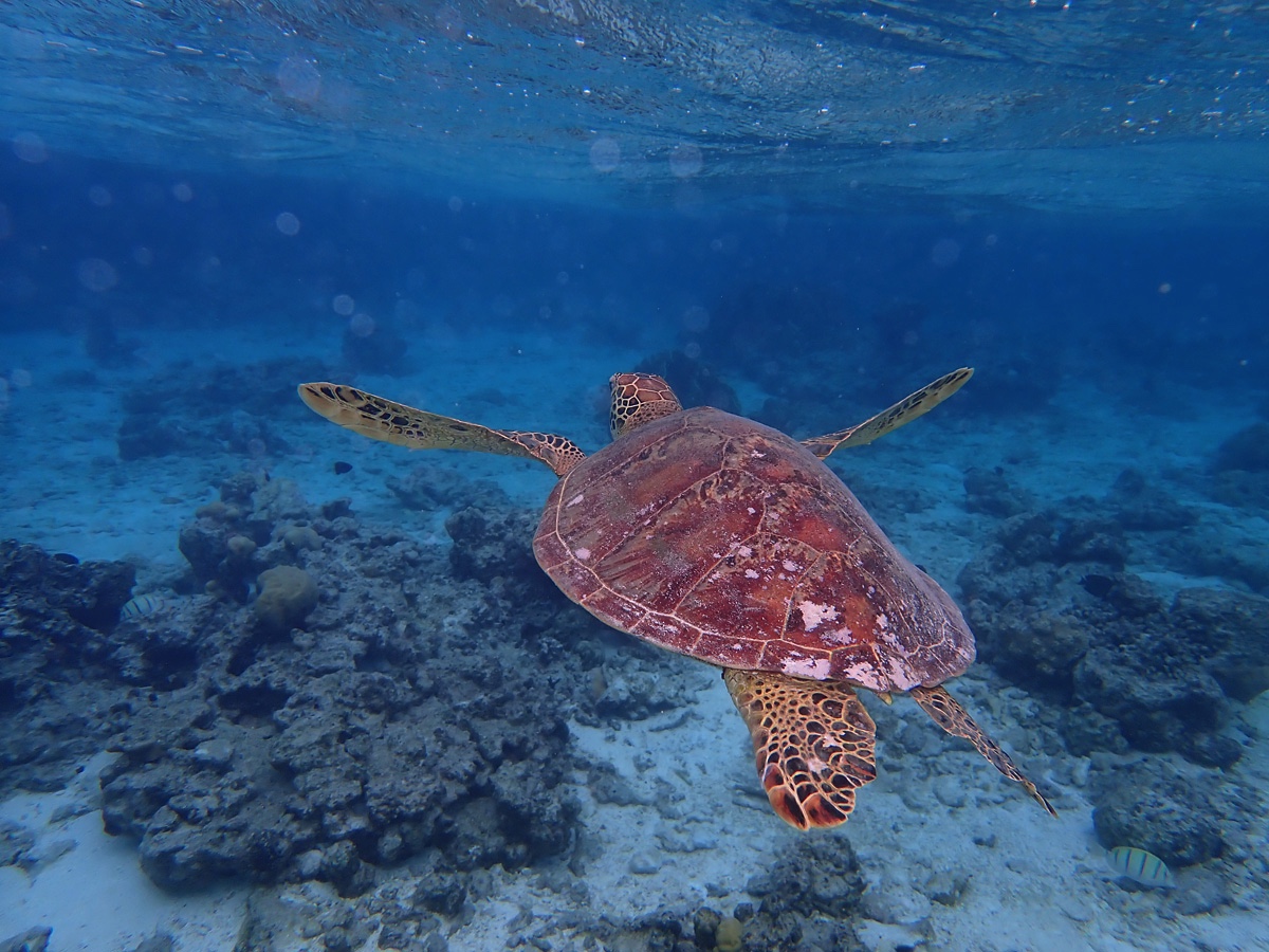 Vee all see-eest elu keeb. Enamikku osa saarest ümbritseb korallrahu aga mitte selline nagu Prantsuse Polüneesias. Siin on vesi seespool korallrahu väga madal vaid 1-2 m. See ei ole laevatatav. Korallide vahel kihab värvilistest kaladest ja nendes kohtades, kus korallrahurõngas on suuremad avad, näeb ka suuri ookeanikalu ning merikilpkonni. Naine käis ühes sellises kohas snorgeldamas. Kilpkonnad on inimestega nii harjunud, et lasevad enda kõrval ja kohal ujuda ja isegi kilpi silitada. Uskumatu!